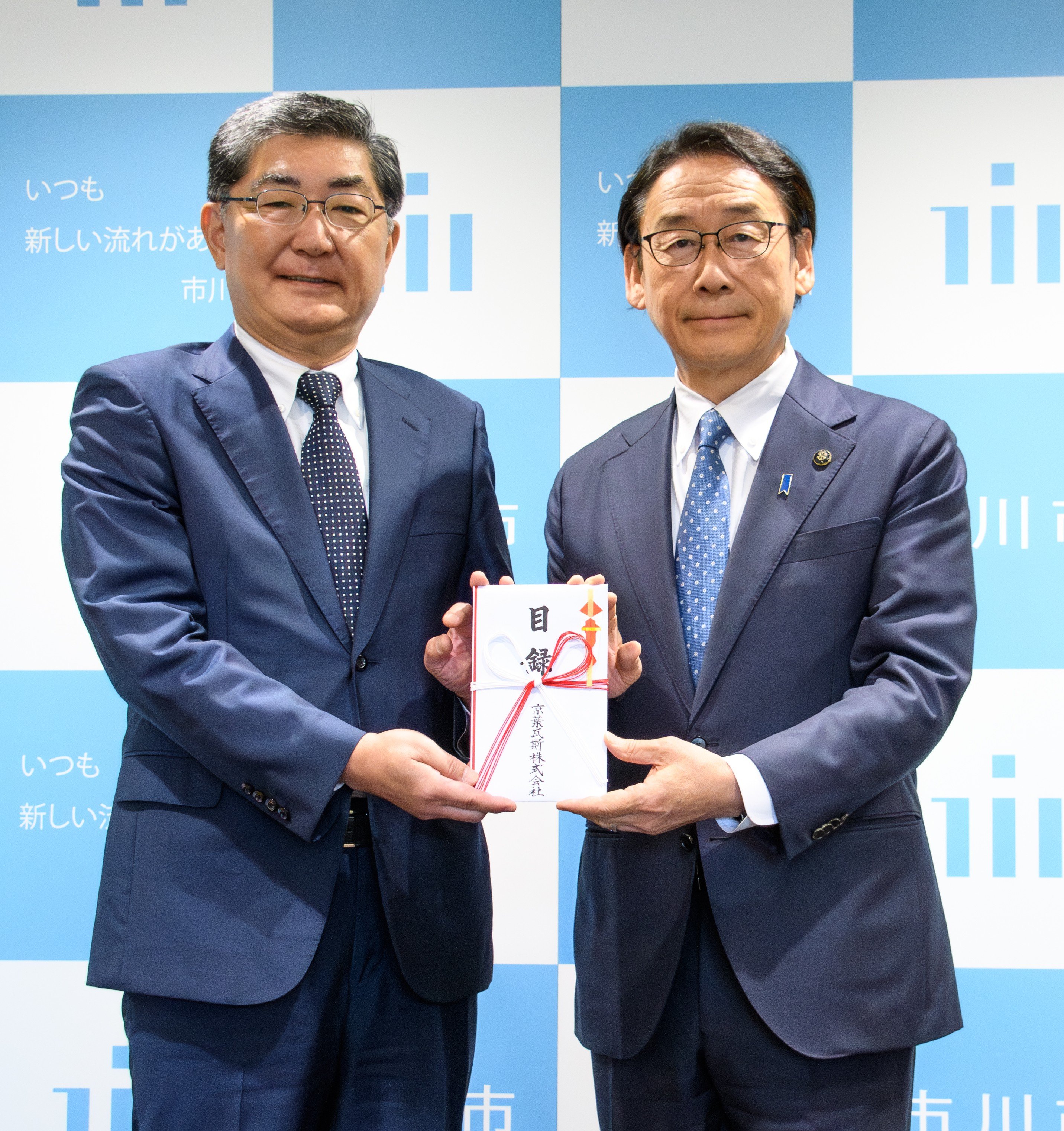 江口 孝 代表取締役社長(左)、田中 甲 市川市長(右) 於 市川市役所内