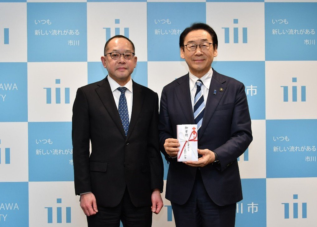 この募金は市川市を通じて同市社会福祉協議会へ寄付するため、京葉ガス「小さな親切」の会会長を務める当社取締役常務執行役員 久能剛一が市川市役所を訪れ、田中甲市長に手渡しました。