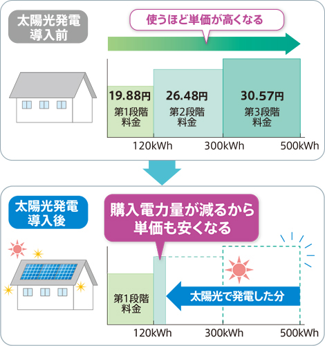 現在の電気料金のしくみは、使えば使うほど単価が高くなります。太陽光発電で発電した分で、購入電力量を減らせば電気料金単価も安くなります。