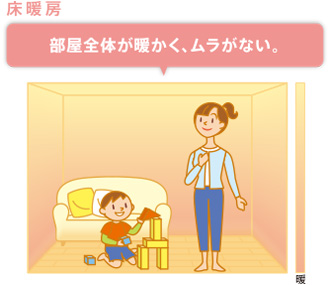 床暖房なら足元からじんわりと、部屋全体がムラなく暖まります。手足やつま先が冷えやすい女性やお年寄りにもやさしく、勉強をがんばるお子さまのお部屋にもピッタリです。